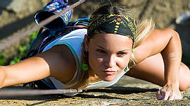 Na první pohled to vypadá docela snadno. Nohy jako by byly přilepené k malým stupům, tělo je natažené, prsty levé ruky svírají úzký chyt ve výšce hlavy, pravá ruka hledá oporu na malé římse. Pak leze...